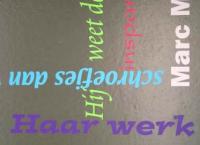 In four weekly sessions the texts were applied, thickening the ‘text-carpet’ into a nearly closed braided mat. Then it remained on view for another fortnight. Timidly the visitors trod on the constantly growing ‘text-carpet’. The same diffidence as when you visit an old church and are bound to walk over gravestones. Reading sidelong the often remarkable epitaphs, which evoke a vague image of the person buried. An equally vague image was called forth by reading the colourful lines about all those invisible paintings. A vagueness that put your imagination to work.