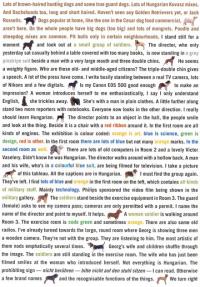 I stand still for a moment and look out at a small group of soldiers. The director, who only yesterday sat casually behind a table covered with too many books, is now standing in a grey pinstripe suit beside a man with a very large mouth and three double chins. He seems a weighty figure. Who are these old- and middle-aged citizens? The triple-double chin gives a speech. A lot of the press have come. I write busily standing between a real TV camera, lots of Nikons and a few digitals. Is my Canon EOS 500 good enough to make an impression? A woman introduces herself to me enthusiastically, I say I only understand English, she trickles away. She’s with a man in plain clothes. A litte futher along stand two more reporters with notebooks. Everyone now looks in the other direction. I really should learn Hungarian. The director points to an object in the hall, the people smile and look at the thing. Beside it is a chair with a red ribbon around it. In the first room are all kinds of engines. The exhibition is colour coded: orange is art, blue is science, green is design, red is other. In the first room there are lots of blue but not many orange marks. In the second room as well. There are lots of old computers in Room 2 and a lovely Victor Vaselery. Didn’t know he was Hungarian. The director walks around with a hollow back. A man and his wife, who’s in a colourful blue suit, are being filmed for television. I take a picture of this tableau. All the captions are in Hungarain. I must find the group again. They’ve left. I find lots of blue and orange in the first room on the left, which contains all kinds of military stuff. Mainly technology. Philips sponsored the video film being shown in the military gallery. The soldiers stand beside the exercise equipment in Room 3. The guard (female) asks to see my camera pass; cameras are only permitted with a permit. I name the name of the director and point to myself. It helps. A woman soldier is walking around Room 3. The exercise room is code green and sometimes orange. There are also some old radios. I’ve already turned towards the large, round room where Georg is showing three men a wooden camera. They’re not with the group. They are listening to him. The most artistic of them nods emphatically several times. Georg’s wife and children shuffle through the image. The soldiers are still standing in the exercise room. The wife who has just been filmed smiles at the woman who introduced herself. Not everything is Hungarian. The prohibiting sign – nicht berühren – bitte nicht auf den stuhl sitzen – I can read. Otherwise a few brand names and the recognisable functions of the things.