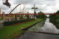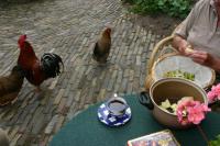 We observe two hands that peel off an apple.17 Next to the table, we see a chicken and a cock – certainly eggs will be eaten here. Both animals looksharply behind them, observing what happens. The pan stands open on the table, without a lid; some apples are in it. The hands exude strength and activity. The photo shows an instant of time: the hands portray her ‘being there’. A cup of coffee is waiting for her on the table. It is a recognisable Dutch impression, a private moment outside in the garden, with the chickens keeping her company. Observing their attitude, one can guess that they are used to have human beings coming close to them, even if they can shoot away very quickly, as their expression shows us that the situation is somehow different for them. Another picture presents a boy near the water, fishing, while behind him there is an impressive attraction park with huge machines to make the clients float through the air, looking for sensations and stimuli.18 He sits calm near the water, concentrated on his fishing-rod. Both pictures are instants of pleasure, of enjoyment of being in a place that makes us forget that time passes by. Being there becomes eternal in this picture.